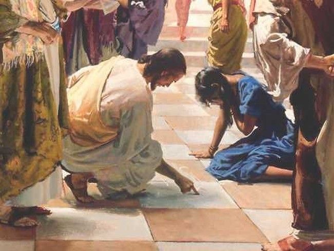 «In quel tempo. Il Signore Gesù si avviò verso il monte degli Ulivi. Ma al mattino si recò di nuovo nel tempio e tutto il popolo andava da lui. Ed egli sedette e si mise a insegnare loro. Allora gli scribi e i farisei gli condussero una donna sorpresa in adulterio, la posero in mezzo e gli dissero: "Maestro, questa donna è stata sorpresa in flagrante adulterio. Ora Mosè, nella Legge, ci ha comandato di lapidare donne come questa. Tu che ne dici?". Dicevano questo per metterlo alla prova e per avere motivo di accusarlo. Ma Gesù si chinò e si mise a scrivere col dito per terra. Tuttavia, poiché insistevano nell'interrogarlo, si alzò e disse loro: "Chi di voi è senza peccato, getti per primo la pietra contro di lei". E, chinatosi di nuovo, scriveva per terra. Quelli, udito ciò, se ne andarono uno per uno, cominciando dai più anziani. Lo lasciarono solo, e la donna era là in mezzo. Allora Gesù si alzò e le disse: "Donna, dove sono? Nessuno ti ha condannata?". Ed ella rispose: "Nessuno, Signore". E Gesù disse: "Neanch'io ti condanno; va' e d'ora in poi non peccare più".»